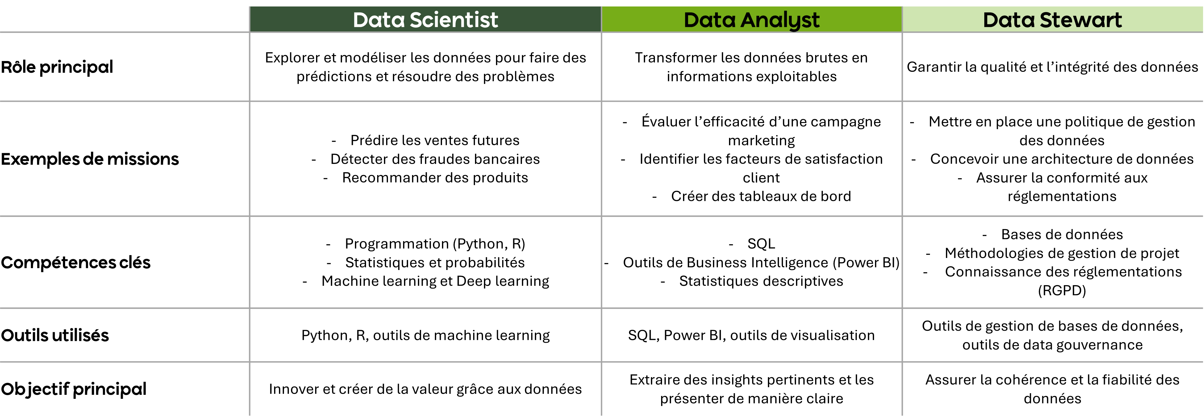 Tableau comparatif des 3 métiers
